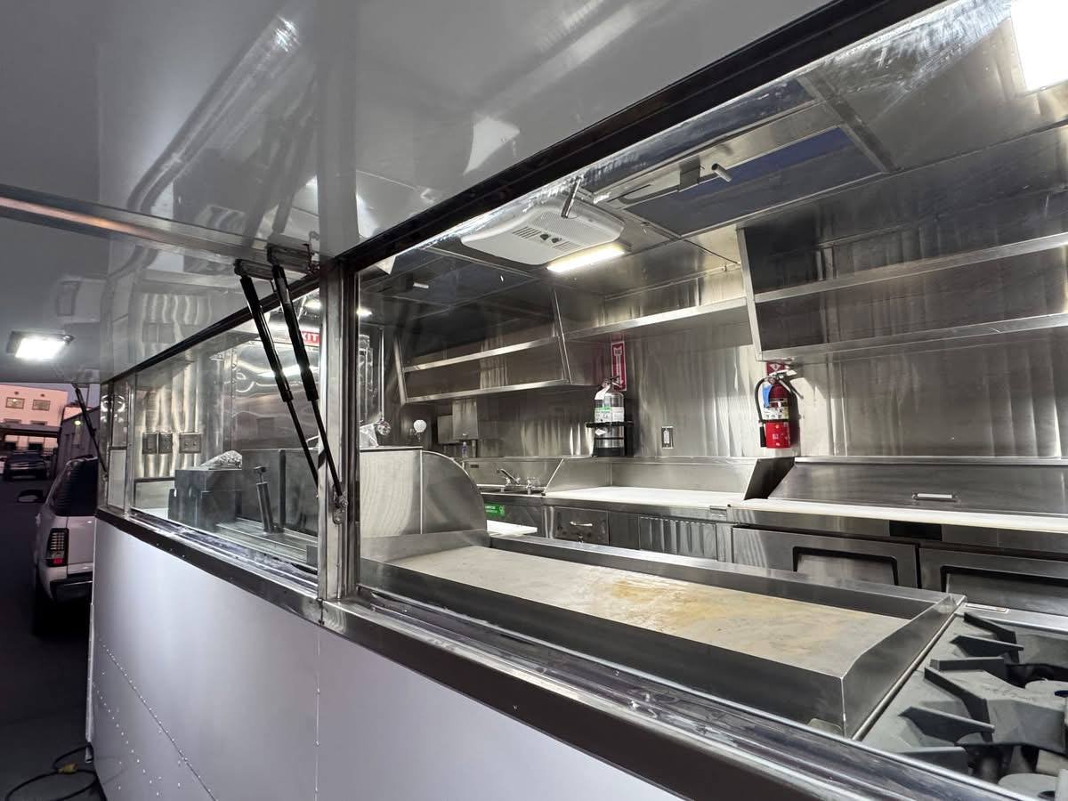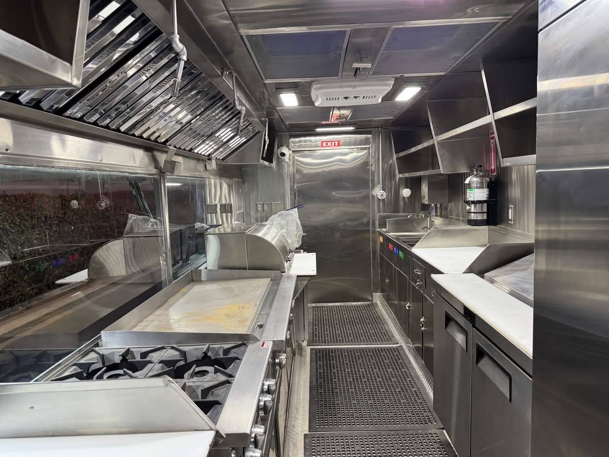 This truck comes pre loaded with everything you need to launch immediately. The kitchen includes a commercial fryer, flat griddle, steam table, fridge units, stainless sinks, and prep tables. Whether you are searching for fully equipped food trucks for sale, custom food trucks for sale, or a starter sized small food truck for sale, this unit offers power, space, and compliance in one package.
